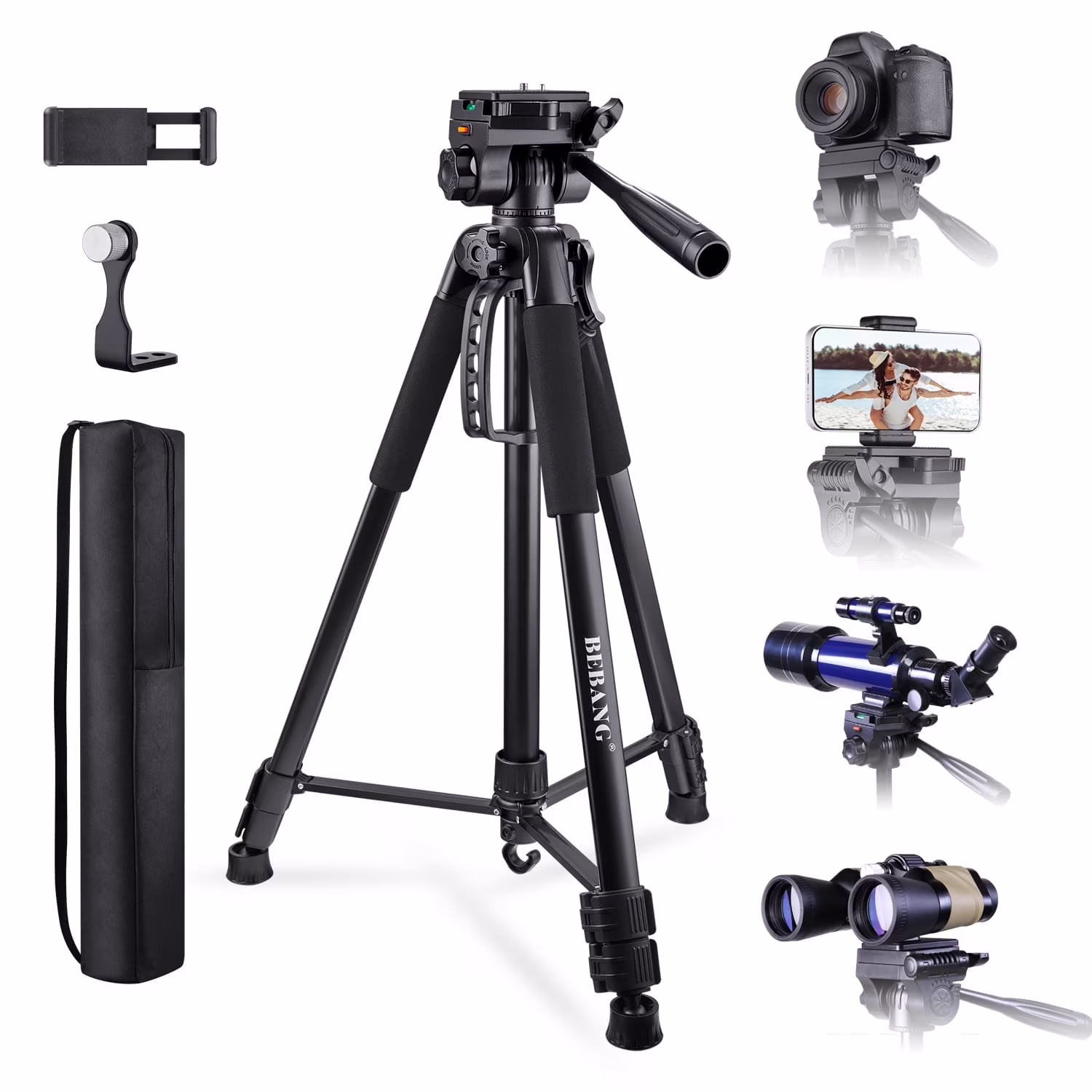 BEBANG Camera tripod is a lightweight and highly adjustable photography companion, offering a height range of 24 to 67 inches. Constructed from durable engineering plastic and lightweight aluminum alloy, it offers excellent stability even in mild outdoor conditions, withstanding wind forces up to 3 and support up to 8.8 pounds. The Camera tripod is sturdy yet lightweight design allows for easy portability, making it an ideal choice for frequent location changes and travel. The camera tripod’s head boasts 360° adjustability, enabling seamless horizontal and vertical rotation, ensuring your camera or smartphone can be precisely aligned with your target. Furthermore, its smooth rotating joints allow for effortless angle adjustments without any loss of focus. Equipped with clip and adapter, camera tripod compatible with a wide range of devices, including cameras, mirrorless cameras, ring lights, projectors, and smartphones, binoculars,telescope, this multipurpose tripod is perfect for capturing memorable photos and videos at events, parties, hikes, sports events, as well as for shooting YouTube videos, vlogs, live streams, and online meetings. With its versatility and durability, BEBANG Camera tripod is a must-have for any photography or videography enthusiast.