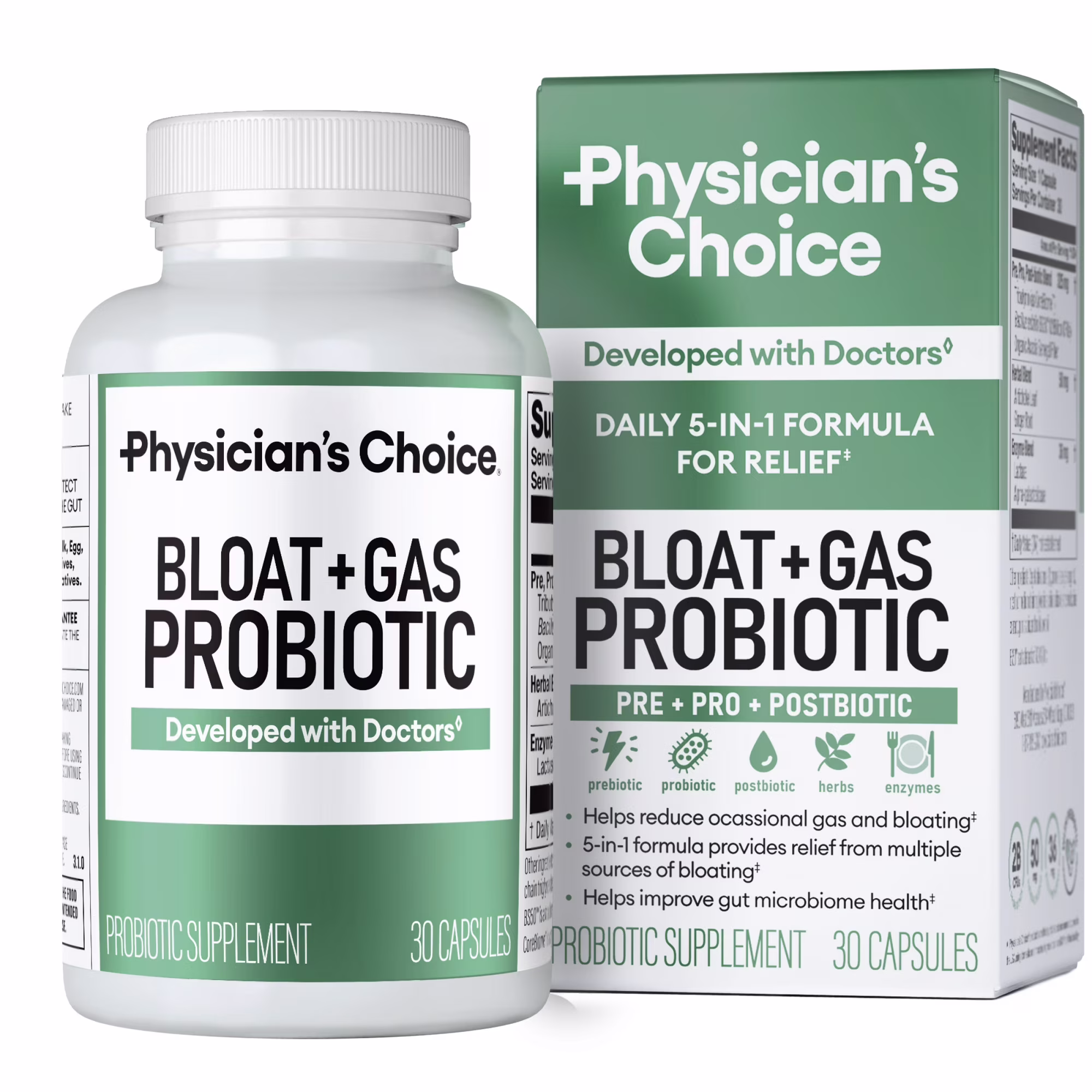 Physician’s Choice Bloat & Gas Probiotic offers daily relief from digestive discomfort, helping to prevent bloating and reduce gas caused by hard-to-digest foods. This 5-in-1 formula combines prebiotics, probiotics, postbiotics, digestive enzymes, and soothing herbs in one capsule to beat bloating before it starts.5-in-1 Comprehensive Formula: Combines prebiotics, probiotics, postbiotics, enzymes & soothing herbs in one daily pill. With 2B CFUs & CoreBiome postbiotic, strengthen the gut lining & support nutrient absorption for better digestive health. Same great product you love, with a new look. Packaging May Vary!